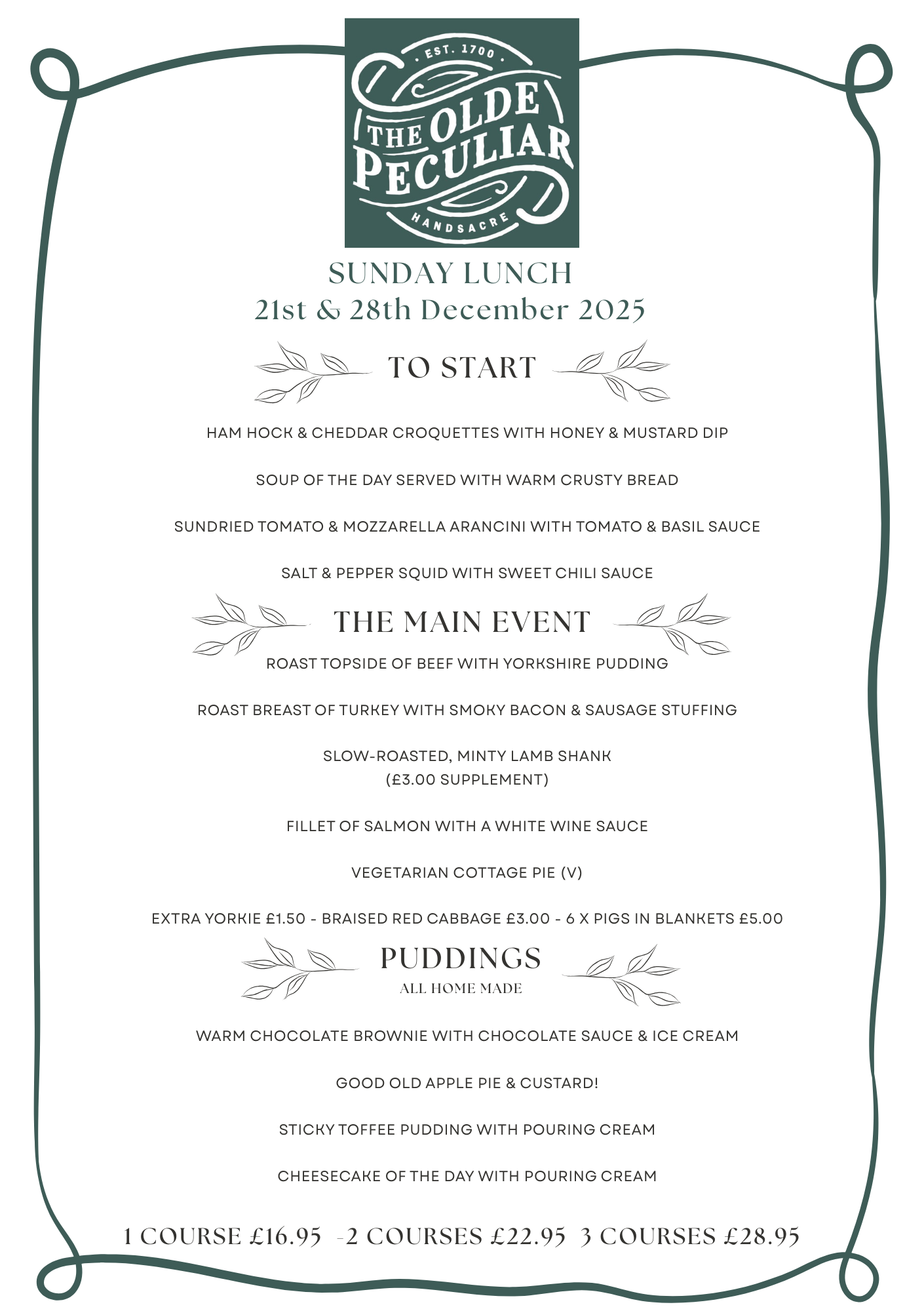 ✨ Make the most of the last two Sundays in December at The Olde Peculiar ✨ Forget the cooking, forget the washing up – let us do it all for you 🍽️ Come and join us for a lovely, relaxed pub lunch in our cosy village pub. 🔥 Warm up by the wood burner 🍺 Traditional beams & plenty of character 😊 Friendly atmosphere and a warm welcome guaranteed It’s the perfect way to enjoy the festive season without the stress.